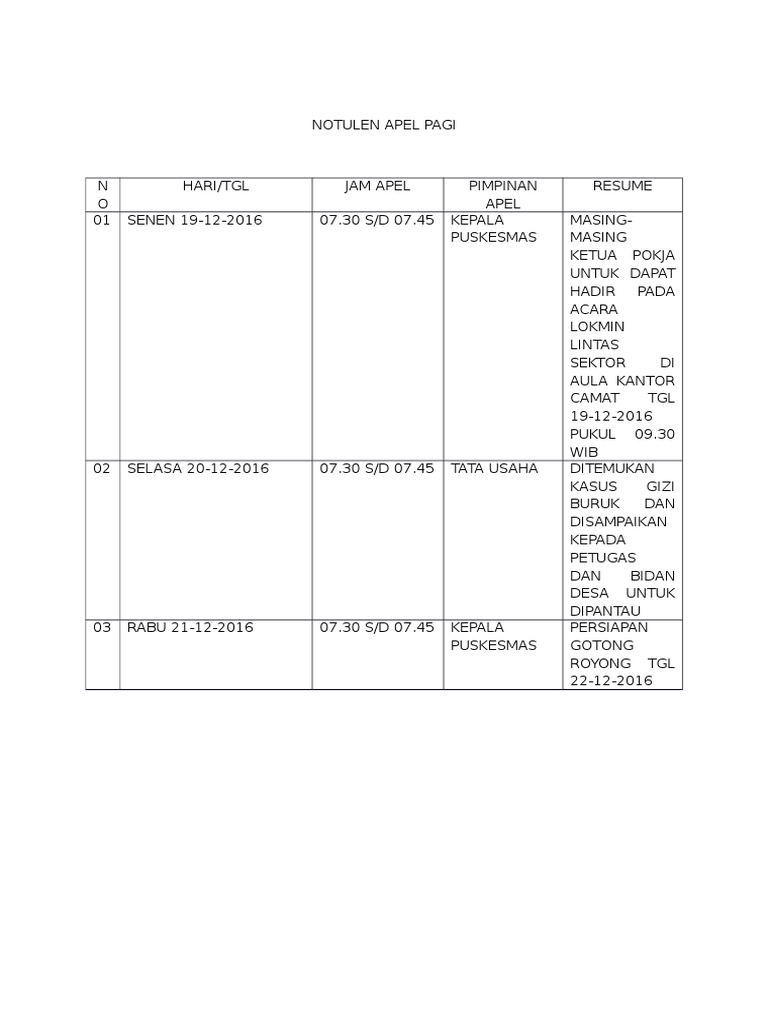 Contoh Notulen Apel Pagi Di Puskesmas : Sebelum melayani,mari kita satukan pemikiran, visi dan misi puskesmas.. Contoh notulen rapat merupakan hal yang wajib dibuat saat kita melakukan pertemuan untuk kinerja perusahaan lebih baik. Sebelum melayani,mari kita satukan pemikiran, visi dan misi puskesmas. Notulen rapat berfungsi sebagai bukti dokumentasi tertulis setelah mengikuti suatu kegiatan atau acara tertentu. Ya allah, tuhan yang maha pengasih. Notulen rapat dibutuhkan oleh puskesmas untuk mengetahui hasil rapat yang diadakan di tempat tersebut.